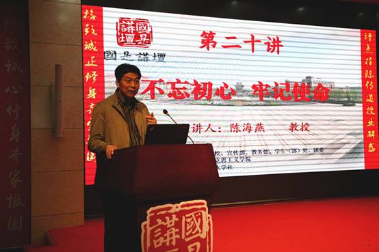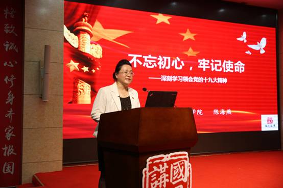 报告中,陈海燕教授分别从“中国共产党的初心与使命是什么”、“新时代中国共产党的历史使命有哪些”、“如何做到不忘初心、不辱使命”三个方面,即从过去、现在、未来三个不同历史阶段,明确了中国共产党“为中国人民谋幸福,为中华民族谋复兴”的可贵初心和历史使命。报告深刻揭示了新时代中国特色社会主义思想的理论贡献:即开辟了马克思主义新境界、中国特色社会主义新境界、治国理政新境界和管党治党新境界。陈教授指出,“不忘初心、牢记使命”要求我们按照“新时代党的建设总要求”,加强党对一切工作的领导,加强党的政治建设,全面从严治党。十九大报告鲜明地提出了“党的建设总要求”, 强调把“党的政治建设”摆在首位,这是党的十九大在党建理论创新方面的最大亮点。“不忘初心、牢记使命”要求我们统筹推进“五位一体”总体布局,协调推进“四个全面”战略布局。“不忘初心、牢记使命”还要求我们统揽中国特色社会主义新时代伟大斗争、伟大工程、伟大事业、伟大梦想“四个伟大”的新使命,完成民族独立、人民解放和国家富强、人民幸福两大历史任务,实现中华民族伟大复兴的历史使命。