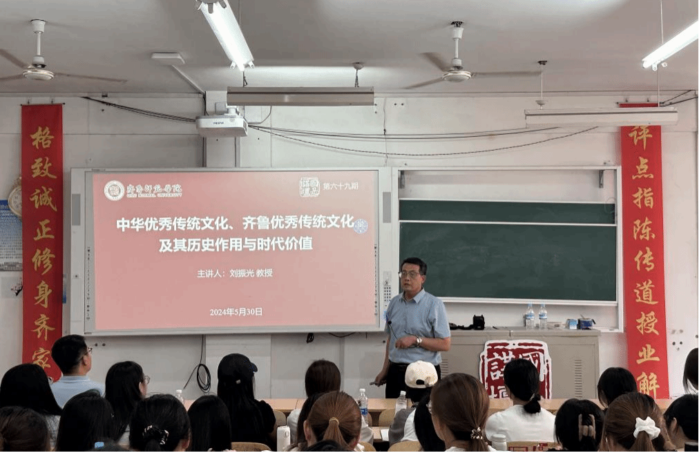 刘振光教授结合学生实际,运用自身丰富专业知识和从教经验,讲授了中华优秀传统文化及齐鲁优秀传统文化的主要内容,激励同学们要有为天地立心、为生民立命、为往圣继绝学、为万世开太平的决心与斗志。他引导同学们要始终保持居安思危的前瞻性、自强不息的奋斗精神、超越自我的大爱精神并以厚德载物作为自己为人处世的根本原则。刘振光教授还阐释了中华优秀传统文化、齐鲁优秀传统文化的历史作用及时代价值,为我们更好理解中华优秀传统文化的“双创”提供了新思路。