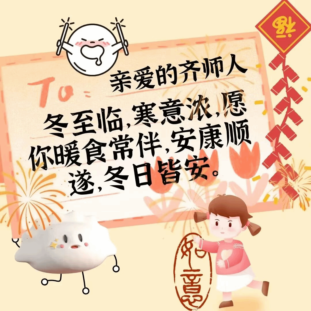 冬至昼短夜长,此后白昼渐长、阳气渐盛,恰如求学之路,偶有低谷蛰伏,终会迎来向上生长的时光。致齐师师长:冬日授课辛劳,愿你晨昏安暖,万事顺遂,在教书育人的时光里,亦能寻得片刻休憩,拥一份冬日惬意;致齐师学子:愿借冬至蓄力,沉心笃学,于书页间积累学识,于寒冬中涵养初心,待寒尽春归时,不负时光、不负期许,带着积累与热忱,奔赴更明朗的前路;也愿每一位齐师青协人,怀揣热忱,传递温暖,在志愿服务中践行初心,让善意如暖阳,驱散寒冬凉意。