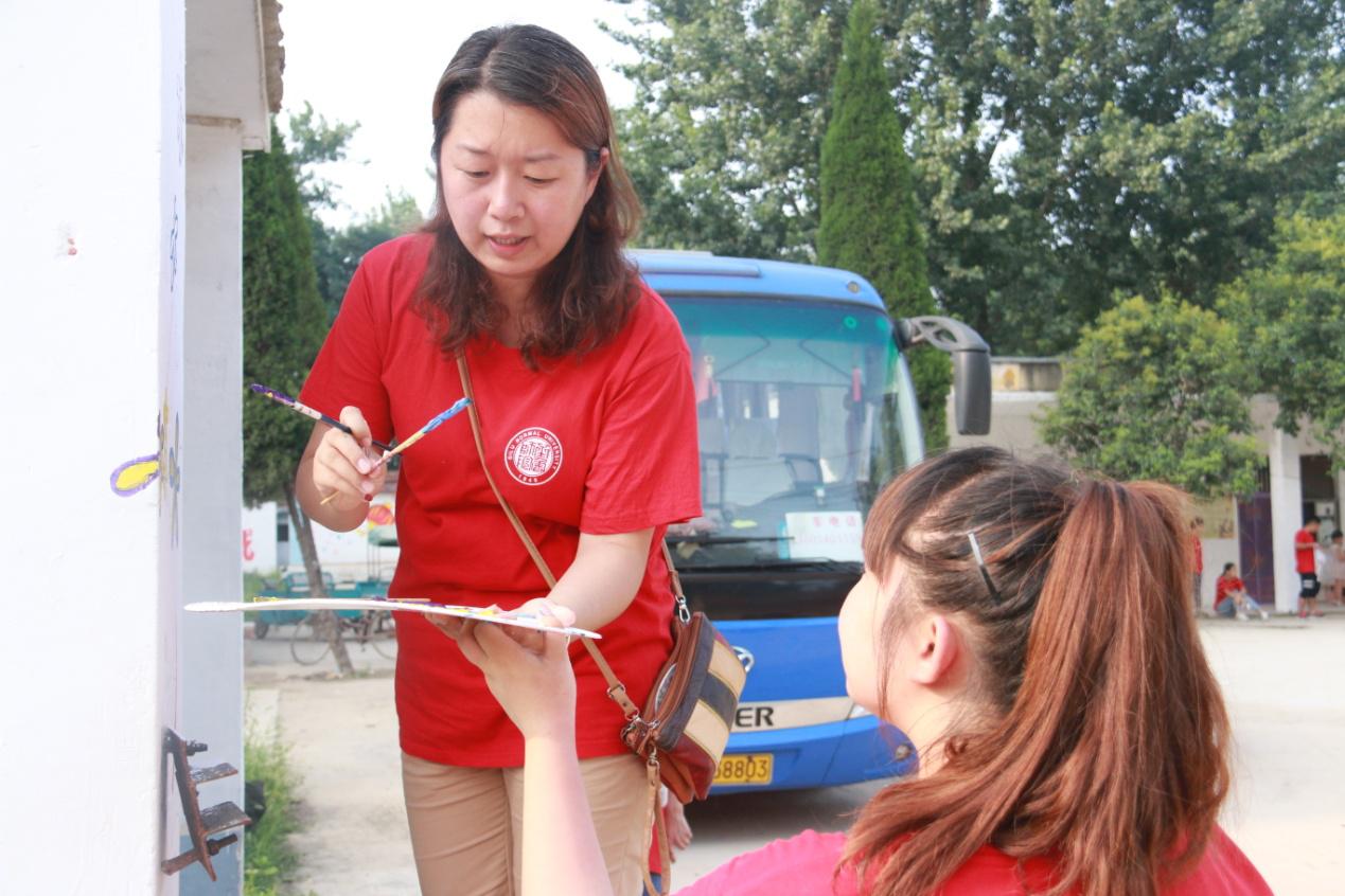 其次是责任感,在此次单县三下乡活动过程中,我们遇到了不小的挑战,一连几天都是阴沉沉的阴雨天,导致我们的墙绘活动一时无法进行,经过几天的焦急等待,终于在返程的前一天遇到了晴空。在高强度的墙绘任务前,我们只剩下了半天的时间,美丽乡村绘画组的四个成员竭尽全力,其他成员面对此情此景也都纷纷上场,没有绘画功底的就主动涂色,大家各司其职,经过了墙面清理、刷底、起稿、弹线、上色等工序,终于在预定的时间内完成了墙绘任务,当队员们空着肚子抵达住处时,已是华灯初上。在那一刻,我看到了队员的责任和担当,大家同进退,有困难一起克服,有任务主动承担,我被队员身上散发出来的责任感和使命感所深深感染。