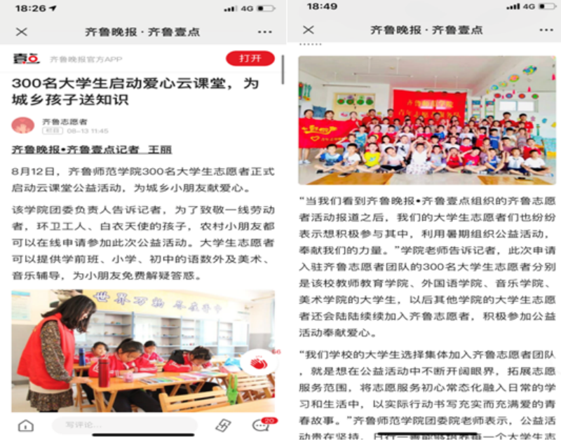 云上创新,公益心不停歇。今年暑期,为进一步扩大“三下乡”社会实践影响力,提升活动效能,我校青年志愿者协会与齐鲁晚报·齐鲁壹点对接,联合音乐学院、教师教育学院、外国语学院10余支社会实践队伍共计300余名师生加入齐鲁志愿者团队,打造“三下乡-爱心云课堂”,通过线上线下相结合的方式,为数百名留守儿童、家庭贫困儿童、抗疫一线医护人员子女开设课业辅导、手工、绘画、英语口语练习等课程。齐鲁晚报·齐鲁壹点连续刊发近20篇报道为青年志愿者们点赞助力。