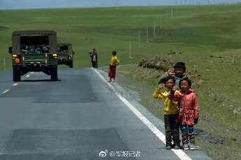 藏族小朋友路遇77集团军军车立即站直敬礼,解放军鸣笛回礼。