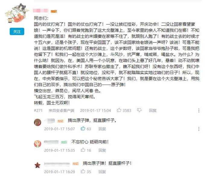 网友@眸几啊QAQ 说:那时候国家多么困难啊,外国人欺负咱们,可我们团结啊,再困难的日子就这么走过来了。如今的安稳生活,感谢先辈们的付出!人民永远铭记!