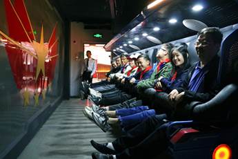 体验者被机械臂推送至一个直径20米的巨型球幕中,从空中俯瞰巍峨的宝塔山、气势恢宏的壶口瀑布、南泥湾、梁家河……飞越延安的一排排窑洞、一片片树林……