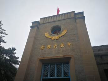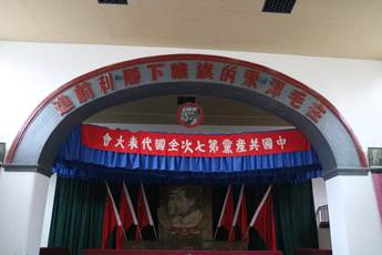 七大会址中央大礼堂,直到改革开放前都是延安最华丽的建筑。大礼堂是由基督教堂改建而成,灰黄的砖墙配上蓝色的窗格,显得质朴庄严。主席台上悬挂着毛泽东和朱德的巨幅画像,鲜艳的党旗挂在两边。在主席台的正上方,悬挂着一条引人注目的横幅:“在毛泽东的旗帜下胜利前进!”