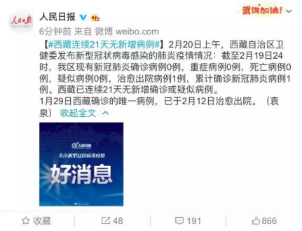 西藏已连续21天无新增确诊或疑似病例。1月29日西藏确诊的唯一病例,已于2月12日治愈出院。