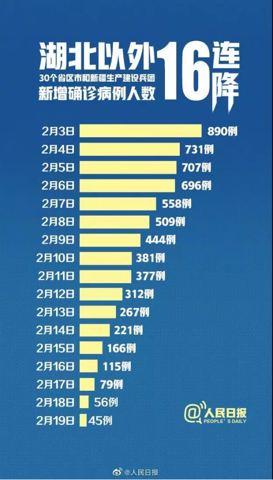 据国家卫健委数据统计,2月19日0—24时,全国除湖北以外地区新增确诊病例45例,连续第16日呈下降态势。
