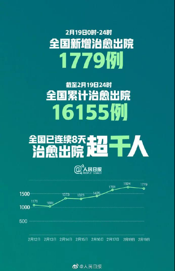 截至2月19日24时,全国累计治愈出院16155例。