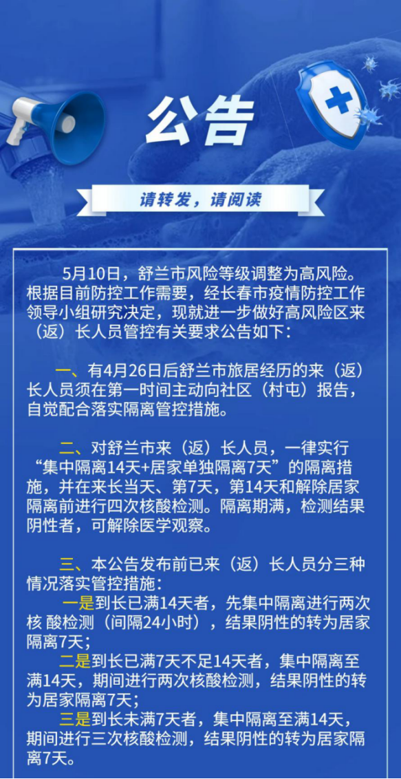 吉林长春10日发布通知,舒兰来返人员一律执行“14+7”隔离,做4次核酸检测。