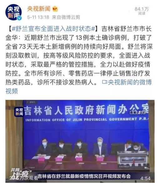 5月11日,吉林省舒兰市市长金华在新闻发布会上说,近期,舒兰市出现了13例本土确诊病例,打破了全省73天无本土新增病例的持续向好局面。