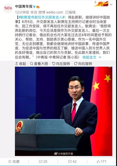 6月5日,外交部发言人耿爽在主持例行记者会时当场宣布,因工作安排,将不再担任外交部发言人。
