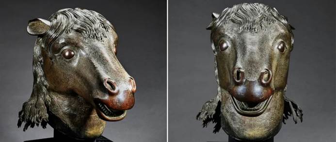 马首铜像为意大利人郎世宁设计,融合了东西方艺术理念与设计风格,清乾隆年间由宫廷匠师精工制作,以精炼红铜为材,色彩深沉厚重,以失蜡法一体铸造成型,神态栩栩如生,毛发分毫毕现,历百年风雨而不锈蚀,展现出极高的工艺水准,是一件非凡的中国古代艺术品。