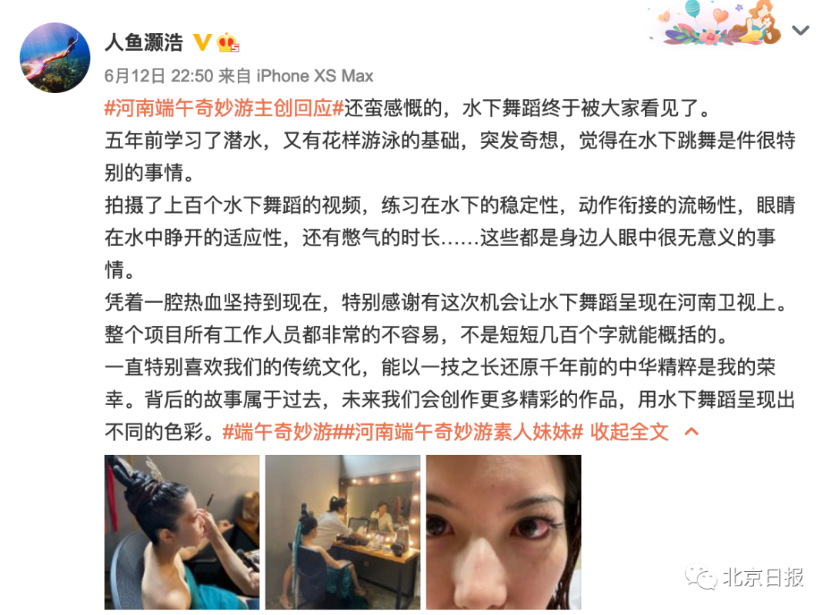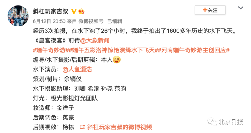水下演员何灏浩也发文回忆拍摄经过“拍摄了上百个水下舞蹈的视频,练习在水下的稳定性,动作衔接的流畅性,眼睛在水中睁开的适应性,还有憋气的时长……”“一直特别喜欢我们的传统文化,能以一技之长还原千年前的中华精粹是我的荣幸。”