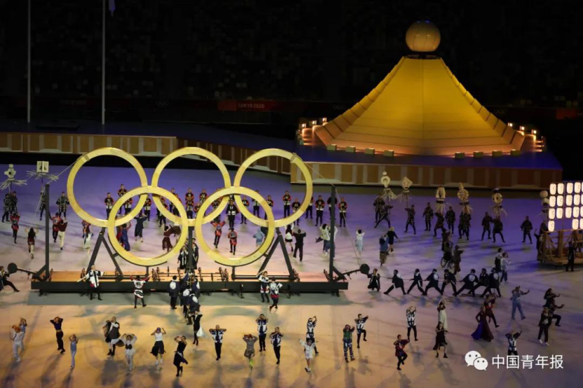 主创团队为奥运五环的展示构思了巧妙的创意——1964年东京奥运会播下树种,树种发芽并长成大树,大树用来建造2020东京奥运会场馆和今日展现的五环。