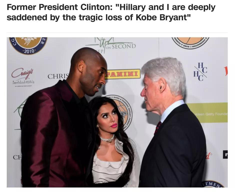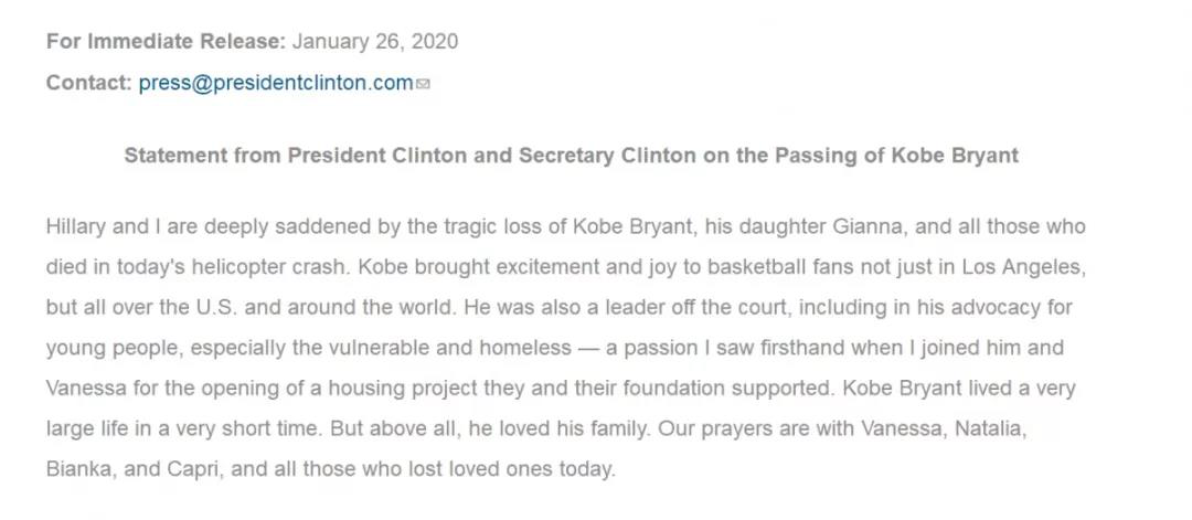 美国前总统克林顿发声:“我和希拉里对科比-布莱恩特、他的女儿吉安娜,以及所有在今天的直升机失事事故中丧生的人的不幸遇难深感悲痛。科比不仅给洛杉矶,更给美国和世界各地的篮球迷们带来了兴奋和喜悦。他也是球场外的领袖,包括他对年轻人的支持,尤其是对那些弱势群体和无家可归的人”