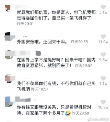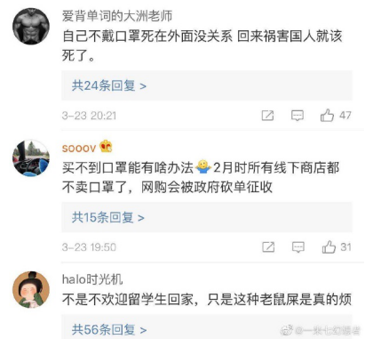 在外受到歧视在内受到辱骂,网络上个媒体为了自身流量,只片面的报道极端事件,完全不顾及广大留学生在国内疫情严重时所做的贡献,面对异国的歧视,国内的辱骂更让人寒心。