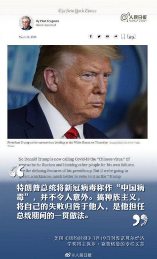 前几天,特朗普在推特上将新冠病毒擅自称为“中国病毒”。有美国网友留言:“特朗普转向了种族主义和排外主义,称COVID-19为‘中国病毒’的言论,作为美国总统发出这种言论,这是要走向仇恨之路。”尽管后来特朗普在讲话中宣称,不会再使用“中国病毒”来指代新冠病毒,但对此前措辞“并不后悔”。