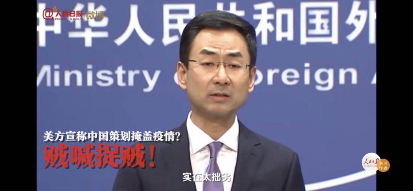 外交部发言人耿爽在例行记者会中说道:中国有句古话“行有不得反求诸己”,如果有人说中国制造病毒,那么请说这种话的人不要戴中国制造的口罩,不要穿中国生产的防护服,不要用中国出口的呼吸机,近几日来,美国一些人处心积虑的将新冠病毒同中国相联系,不断对中国搞污名化,中国人民对此强烈愤慨,坚决反对。无稽之谈,别有用心,美方这种贼喊捉贼,颠倒黑白的把戏实在太拙劣