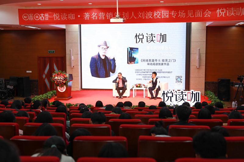 本次活动由中国移动山东分公司和我校联合主办。刘波,杭州万派文化创意有限公司联合创始人、董事长;九歌万派(中国)策划机构创始人、董事长;全国工商联福建省住宅产业商会副长;2015年,刘波和郭羽联合创作的“互联网+商战”小说《网络英雄传I——艾尔斯巨岩之约》是中国第一部讲述“互联网+”商战故事的小说、中国第一部选择移动互联网平台发布的长篇小说,一经推出,便在中国移动“和阅读”上创下两个月突破一亿的阅读量。