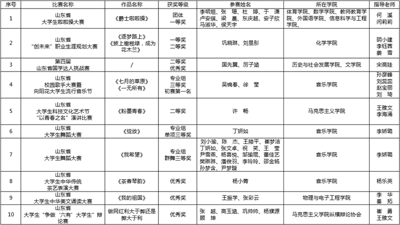 为深入贯彻党的十八大和十八届三中、四中、五中、六中全会精神,认真学习贯彻习近平总书记系列重要讲话精神,以良好青春风貌向建团95周年和党的十九大献礼,我校积极参加由省委宣传部、省委高校工委、团省委、省教育厅、省文化厅、省科协、省学联联合举办的第十五届山东省大学生科技文化艺术节活动和由团省委、省委宣传部、省文明办、省委高校工委、省教育厅、省文化厅、中国孔子基金会等联合举办的以“礼敬国学·滋养青春”为主题的齐鲁学子青春国学荟活动,均取得优异成绩。