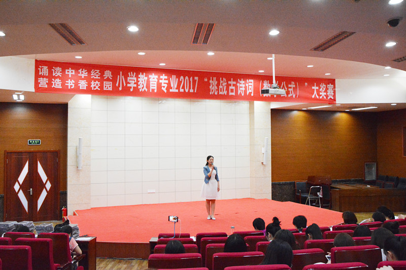 为弘扬祖国优秀的传统文化,夯实小学教育师范生的基本知识和基本技能,让他们在正式进入小学教师这一岗位之前就熟练掌握作为基础学科的语文和数学教学中经典古诗文与数学基本知识,教师教育学院于5月25日举行了主题为“诵读中华经典,营造书香校园”古诗词(数学公式)大赛,王维教授主持本次比赛,2015级小学教育普通本科班和2015级小学教育春季高考本科班全体学生共260人参加了本次比赛。刘文华、滕秀芹、王岩、薛绍聪、祝晓楠等老师担任本场比赛评委。
