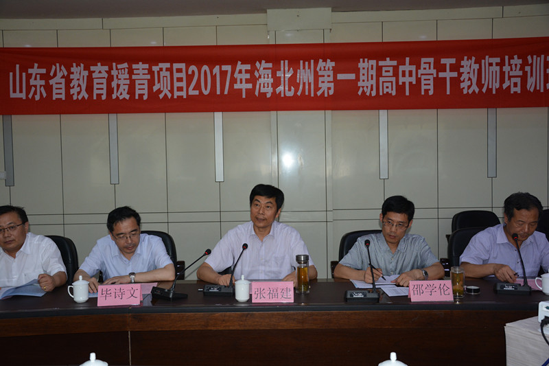 2017年6月11日下午,山东省教育援青项目2017年海北州第一期高中骨干教师培训班开班典礼在济南举行。我校党委委员、副校长张福建,海北州教育科技局副局长邵学伦,山东省师训干训中心毕诗文,新世纪网络公司总经理玄成贵,教师教育学院副院长张英梅,培训班首席专家苗军芙等出席典礼,典礼由双语教师援疆教学中心主任、教师教育学院院长赵延银主持。
