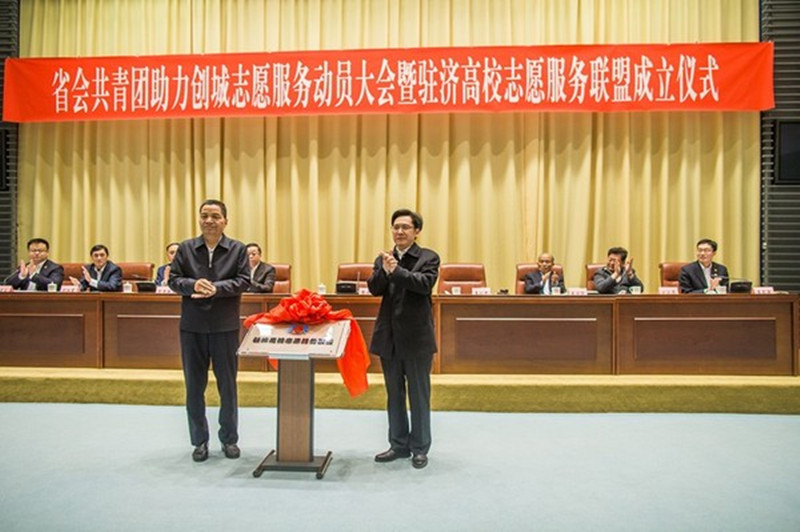 会上,团市委、市志愿者协会联合市文明办共同启动了以“助力创城、志愿先行”为主题的十大志愿服务行动。团省委书记陈必昌和市委常委、市总工会主席王以才共同为驻济高校志愿服务联盟揭牌;市人大常委会副主任许强等领导为山东大学、山东师范大学、以及齐鲁师范学院等26所驻济高校志愿服务联盟成员单位授旗。山东大学青年志愿者代表宣读了题为《志愿青春,爱我泉城,从我做起》的倡议书,号召驻济高校70万在校大学生发扬主人翁精神,争当文明风尚的宣传者、文明行为的践行者、文明创建的推动者,以实际行动助力创城。