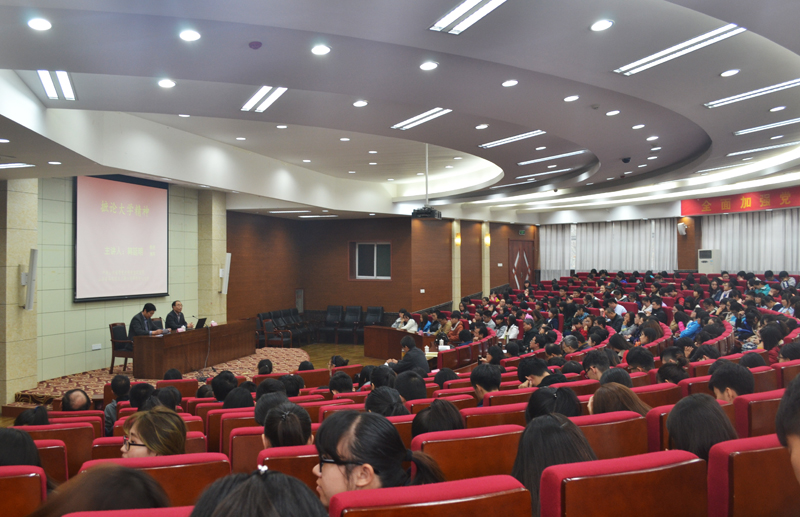 韩教授从大学精神的时代意蕴入手,阐述了守望大学精神、捍卫学术尊严、遏制学术腐败、高扬学者风范的现实意义。随后,韩教授从大学精神的内涵与意义、特征与 功能、内容与指向、培育与建设四个方面对大学精神的旨趣作了生动、深入的阐述,韩教授引经据典,旁征博引,对大学之创新精神进行了系统阐释,强调打破思维 定势、激活思维灵性的重要性。最后,韩教授从重视强化大学精神家园、科学与人文精神相互渗透、坚守秉承大学理念、推进教育国际化、营造充满人性灵性的校园 氛围诸方面阐释了大学精神建设的实践举措。报告风趣幽默,引发阵阵掌声。