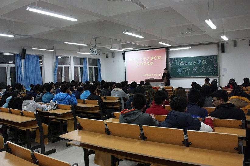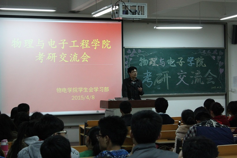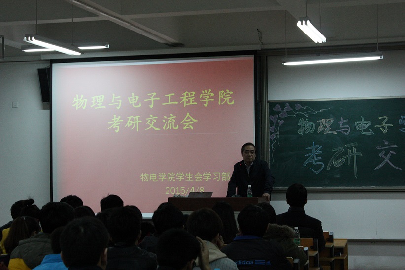 2015年4月8日晚7:00,物理与电子工程学院组织的考研交流会在2号教学楼A209成功举办,出席本次交流会有院长于元勋教授、党总支副书记秦拓以及11级成功考研的学长学姐和我院物理学本科全体同学。