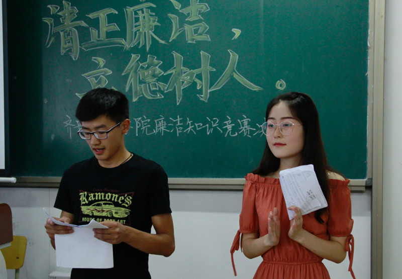 此次知识竞赛活动采取线上线下两种方式同步进行。全校同学积极参与网络答题活动,截止6月8日,5000余名同学进行了线上答题;6月6日下午,廉洁文化知识竞赛线下活动于章丘校区2号教学楼B331进行,全校各学院由两名学生组成各自代表队进行了各环节的比拼。线下知识竞赛活动融知识性、趣味性、严肃性于一体,设置了选择题、判断题、风险题三种形式的竞赛环节,现场氛围轻松而不乏严肃,常识性而又不乏警示性,整场活动虽是一场比赛,但更像是一个廉洁知识的课堂。