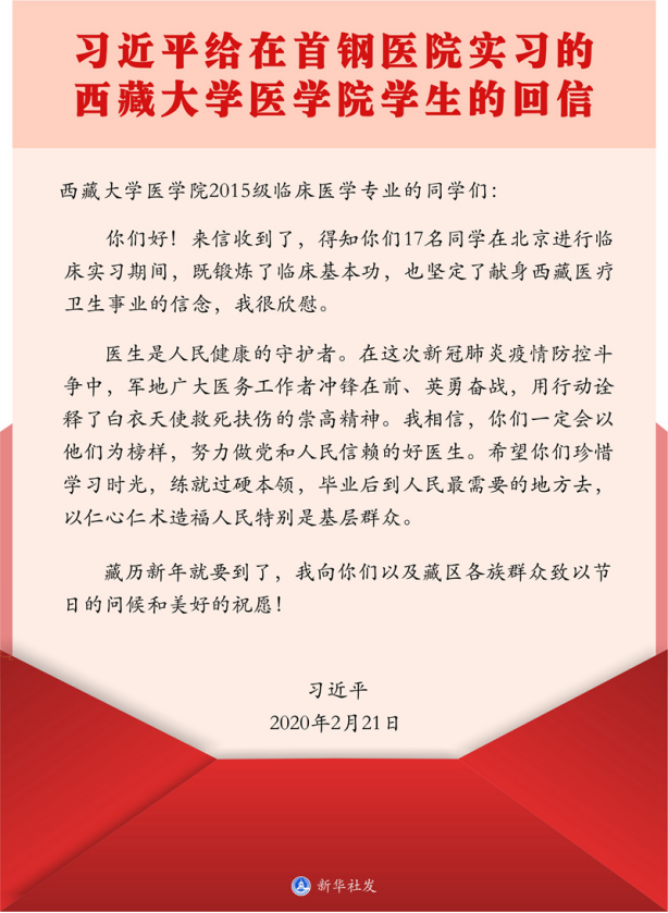 习近平给在首钢医院实习的西藏大学医学院学生的回信