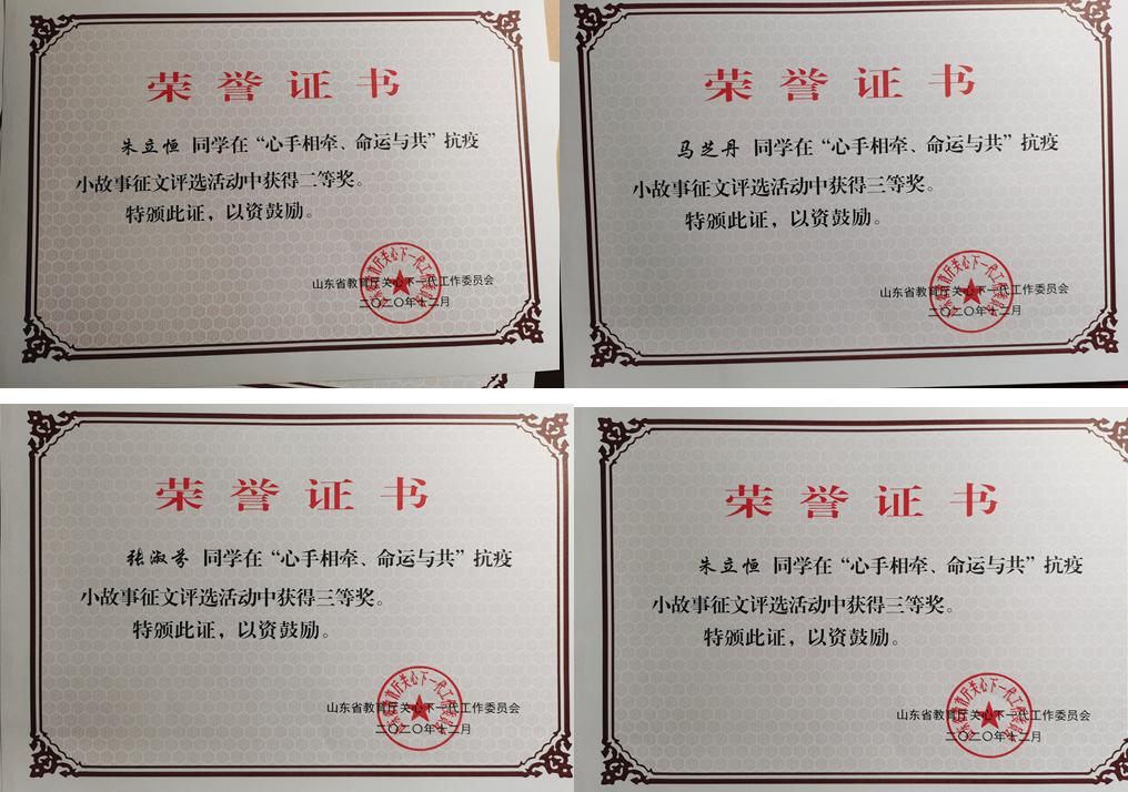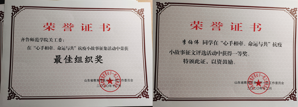 近日,在山东省教育厅关工委组织的全省教育系统“心手相牵、命运与共”抗疫小故事征文活动中,我校关工委荣获最佳组织奖,参评的五篇征文分别取得一个一等奖、一个二等奖和三个三等奖的好成绩。