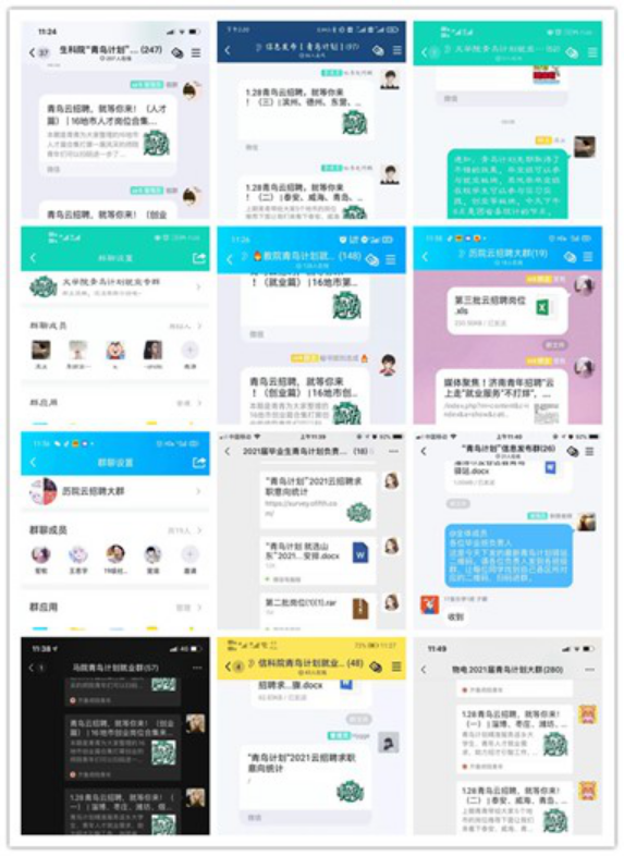 二、全员覆盖到位,成立三级工作专班。为提升青鸟计划云招聘覆盖率,校团委成立校、院、团支部三级青鸟计划就业工作专班,形成三级协同推进模式。各级招募并设置“青鸟联络员”,通过青鸟小程序、各级微信公众号、各级青鸟QQ交流群、微信交流群等,实现岗位信息广泛发布,毕业生全面覆盖;与16地市团委及下属区(县)团委建立校地合作联系,并建立各地青鸟驿站线上微信群100余个;部署各二级学院对有实践、创业、就业意向的毕业生进行统计,并建立各学院青鸟计划各二级学院就业大群。据不完全统计,我校青鸟计划云招聘活动宣传覆盖人数达9000余人,共3400余名毕业生报名参加青鸟计划云招聘活动。