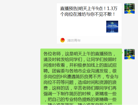 三、有效传递到位,精筛细选差异投递。一方面力争对毕业生进行全面覆盖,另一方面注重差异化、针对性岗位传递,确保毕业生接收岗位高效高质。制作《2021届毕业生“青鸟计划”平台就业意向调查问卷》,面向全体毕业生进行就业意向调查,收集到有效问卷1673条,收到学生建议300余条,进一步明确学生需求;根据我校实际需求,各学院专业特色等,对团省委发布的海量就业岗位进行全面筛选、优中选优,根据不用地域、不同学科类别推送岗位,大大节省学生筛选岗位的时间;根据云招聘活动时间表,通过“齐鲁师院青年”微信公众号、青鸟计划交流群、100余个青鸟驿站等平台,每一场直播、面试都提前预热,让学生充分做好应对准备。预热取得良好效果,几天的云招聘活动,共计一万余人次参加线上直播、面试活动。