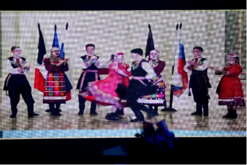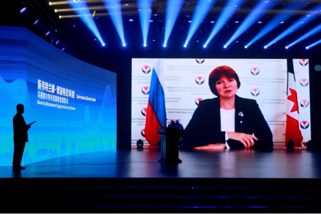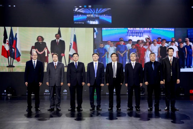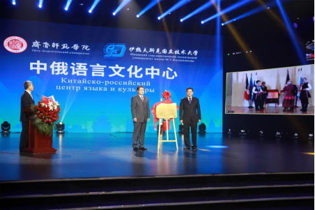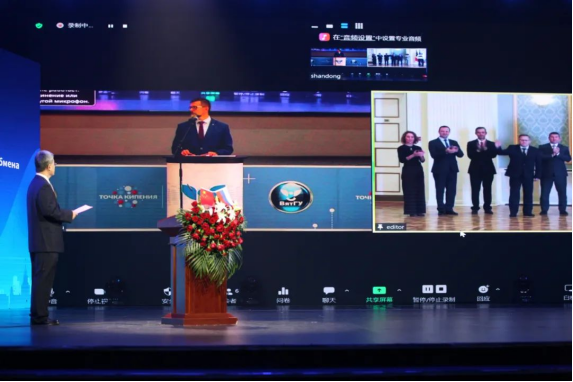 在齐鲁师范学院与伊热夫斯克国立技术大学“中俄语言文化中心”揭牌仪式环节,乌德穆尔特共和国能歌善舞的青年们表演了俄罗斯民族舞蹈,表达对该中心成立的庆贺。秦梦华邀请孙业宝上台共同为两校“中俄语言文化中心”揭牌,同时,伊热夫斯克国立技术大学校长亚力山大·古柏特邀请乌德穆尔特共和国国家政策部长爱德华·彼得罗夫在云端同步揭牌,双方共同见证两校交流合作的重要时刻。