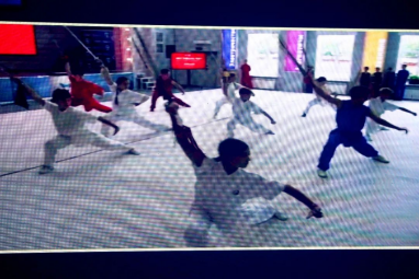 随后的“山东—基洛夫—乌德穆尔特”武术表演无疑将整个武术交流会推向了高潮。三方各自上演了为时20分钟左右的“功夫秀”。齐鲁师范学院大学生武术队为俄方朋友展示了中国传统武术中的拳术、棍术和枪术,个人展示、对练和集体表演相结合,精彩的象形拳、功夫扇、九节鞭、童子功和八段锦等武术项目令人啧啧称赞,展示出我方作为武术交流会东道主的高水准。