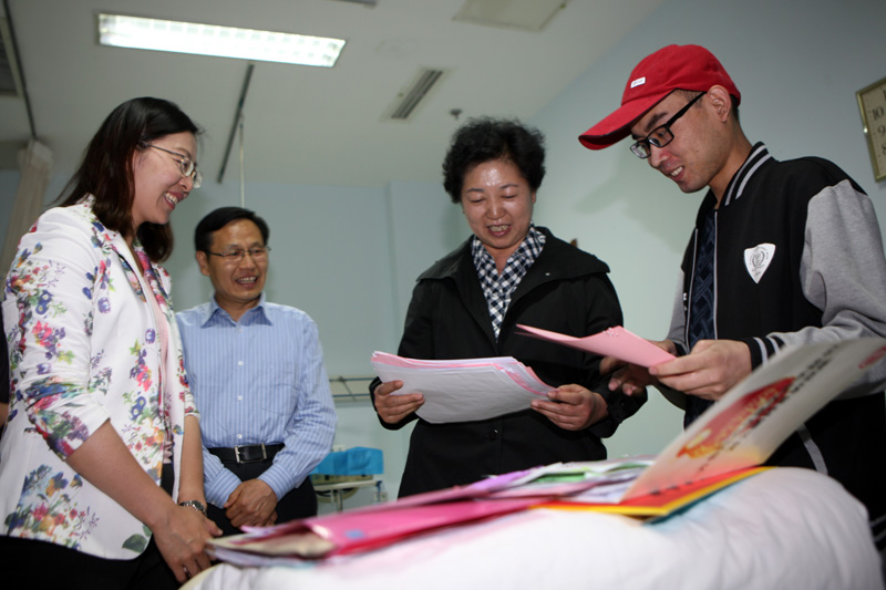 李良斋副书记把在校生们写的“齐鲁师范学院学弟学妹们对云鹏师哥的祝愿册”送给了姚云鹏,转达了老师和同学们对他的关心和祝福。一封封同学们亲笔写的信、画的画,一句句鼓励的话语、祝福的语句表达了学弟学妹们对云鹏师哥的一片片关爱之情。信息科学与工程学院学生会的同学写到“云鹏师哥,你的康复就是我们的幸福!”文学院2012级新闻班全体同学写到“云鹏学长,虽然我们从未谋面,但我们无时无刻不在担心着你。你知道吗?校园里现在花都开了,等你康复了,我们带你到学校来看看。”校学生会青年志愿者协会的同学们写到“云鹏师哥,祝你早日康复,到那时,你带着我们一起去新疆支教,一起为那里的孩子上课!”教师教育学院的赵延银院长也给云鹏写了祝福“祝你战胜病魔,早日康复!梦圆边疆,大家需要你,祖国需要你!”