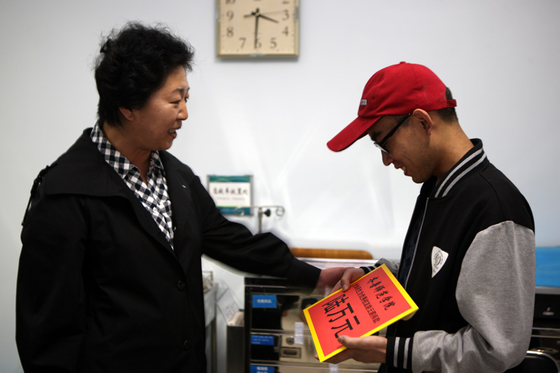 尹方书记在病房里详细了解了姚云鹏同学的病情和治疗情况,叮嘱他要安心配合医生治疗,努力战胜病魔,并把全校师生为姚云鹏同学募捐的6万元捐款送到了他的手中。尹书记亲切地鼓励云鹏同学一定要树立信心,保持良好的心态,并祝愿他早日康复。尹书记拉着云鹏的手动情地说到,“做老师要具有无私奉献的品格,你在新疆做志愿者正是传承了老师们教给你的这种无私奉献的精神,同学们都以你为榜样,老师们以你为荣,学校也以你为荣!每一位老师都把学生当成自己的孩子一样,希望你无论什么时候都不要失去信心,要坚强起来,老师、同学们和你永远在一起!齐鲁师范学院是你永远的家!”