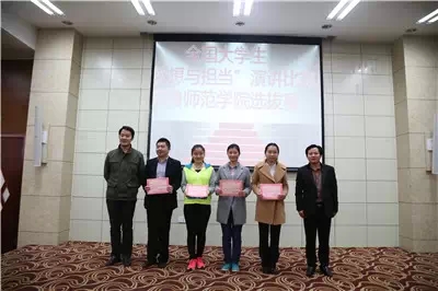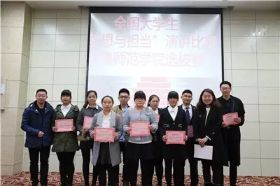 如此正能量的演讲比赛的举行,不仅能锻炼参赛同学的口才和表达,更能引发全体同学的深思。是啊,我们都是21世纪的青年,我们听着中国梦长大,我们理当拿出年轻人该有的斗志,胸怀梦想,勇于担当。借此,小编希望我们师院的全体同学都应当有自己的相关思考,有自己的梦想,有自己的担当。就像马云所说:“梦想还是要有的,万一实现了呢?”