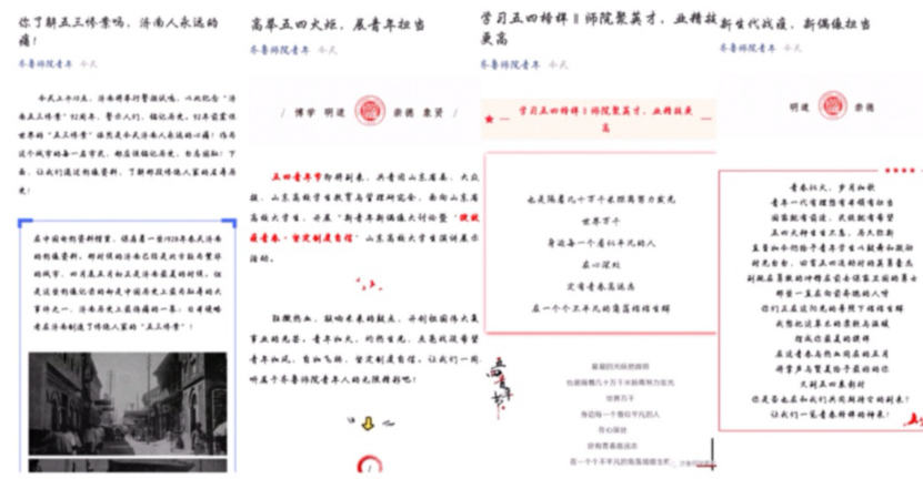 深度剖析偶像,青年有目标。4月19日,我校开展了“新青年新偶像大讨论暨‘绽放战疫青春•坚定制度自信’齐鲁师范学院大学生演讲展示活动”,共征得各学院优秀演讲视频近30份。活动潜移默化地影响着青年人的偶像观、价值观、成才观,激励和引领青年进一步坚定制度自信,投身党和人民最需要的地方发热放光,推崇英雄、崇尚担当、向往奉献的正能量在青年人心底慢慢积聚成塔。此外,校团委借助官方微信、微博等媒体平台陆续推送了《你了解五三惨案吗?济南人永远的痛》、《新声代战疫,新偶像担当》、《学习五四榜样‖师院聚英才,业精技更高》、《高举五四火炬,展青年担当》等文章,旨在激励学校广大青年志以成学,业精于诚,以身边的偶像为榜样,扎实理论功底,提高专业素养,在真抓实干中磨炼实践本领。