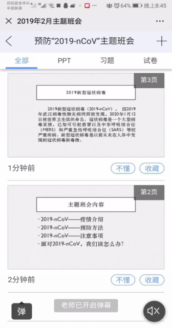 自肺炎疫情以来,外国语学院党政班子积极贯彻落实习近平总书记重要指示精神,疫情期间认真工作,将第一手消息第一时间传达给学院学生。辅导员老师们遵照上级部门的工作部署,未外出参与志愿活动的学生极配合学院工作,认真落实学院的具体要求。外国语学院全体同学时刻关注疫情动态,有效进行自我防护,及时回复学院下发的相关文件,通过微信、QQ等网络渠道及时向各班班长汇报每天的健康情况。除此之外,更有2019级商务英语(本科)一班等班级采用新型方式,进行以“预防‘2019-nCoV’”为主题的网络线上班会,班委精心制作疫情相关PPT,辅以讲解,为全班同学开展了一堂别开生面的线上“公开课”,用实际行动弘扬抗击疫情正能量,为疫情防控贡献力量。