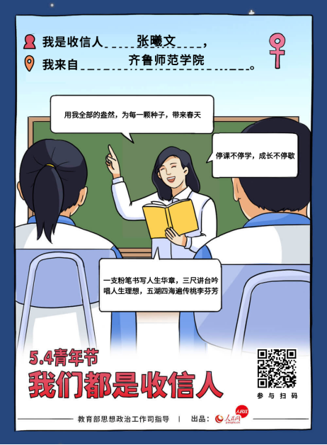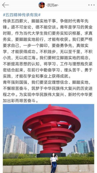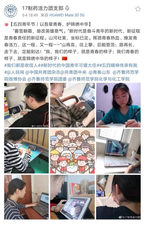 5月4日,化学与化工学院同学们在微博、微信各媒体平台参与#五四青年节#、#五四精神传承有我#、#让青春为祖国绽放#、#我们都是收信人#等热门话题,谈理想、话担当,同全国各地青年共同庆祝青年节日,共同传承五四精神。