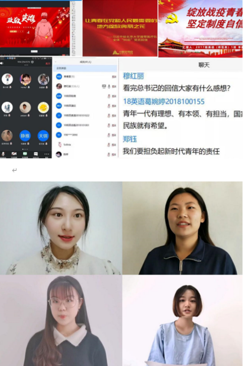 活动前期,学院通过微信公众号的推文留言形式让同学们了解参与,并在班级QQ群广发通知,向同学们宣传两大活动的流程与内容。学院各班级的云班会,于4月30日以班级为单位通过腾讯会议形式进行,主要围绕《习近平给北京大学援鄂医疗队全体“90后”党员的回信》、《习近平给在首钢医院实习的西藏大学医学院学生的回信》两封回信展开学习,在班会中过程中设置QQ群投票及提问讨论的互动环节,期间同学们就当代青年应如何担当社会责任、如何坚定制度自信等问题发起提问讨论,学习成果显著。同时,深化学生对制度优势的认识,学院面向全体同学开展“青春思报国、责任勇担当”主题演讲活动,由同学们录制演讲视频,要求演讲者联系党带领全国人民打赢疫情防控阻击战、推动经济社会发展的生动实践,紧扣“青年”、“担当”“奉献”进行演讲,以此引导学生深刻领悟中国特色社会主义制度优越性。两大主题活动顺利开展。