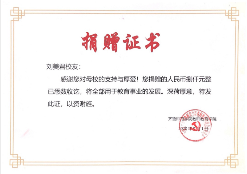 刘美君校友自大三起就萌发了捐赠国家奖学金的想法,如今付诸于实际,希望这笔钱能帮助到更多需要帮助的同学。刘美君认为自己只是普通学子中的一员,她感谢学院对自己的培养,感谢老师们对自己四年来的谆谆教诲,她说无论身在何处,都要做一个充满爱心和有责任心的人;不辜负母校的重托和期待,努力为母校增光添彩。刘美君校友已被东北师范大学录取为教育学原理专业全日制硕士研究生,即将开始新的求学之路。