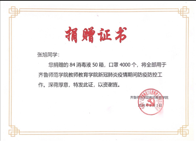教师教育学院负责人代表学院接收了防疫物资,并对张旭同学与其家长表达了深切的感谢。张旭同学表示,作为教院的一员,希望能为学院疫情防控工作贡献出绵薄之力。她呼吁同学们,作为在校的大学生,要遵守学校管理制度,做好个人防护,学好本领,回馈母校,奉献社会。