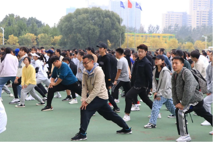 教师教育学院团总支副书记李炜琛,辅导员教师为学生提供热身指导,并与同学一同奔跑,感受运动之美。