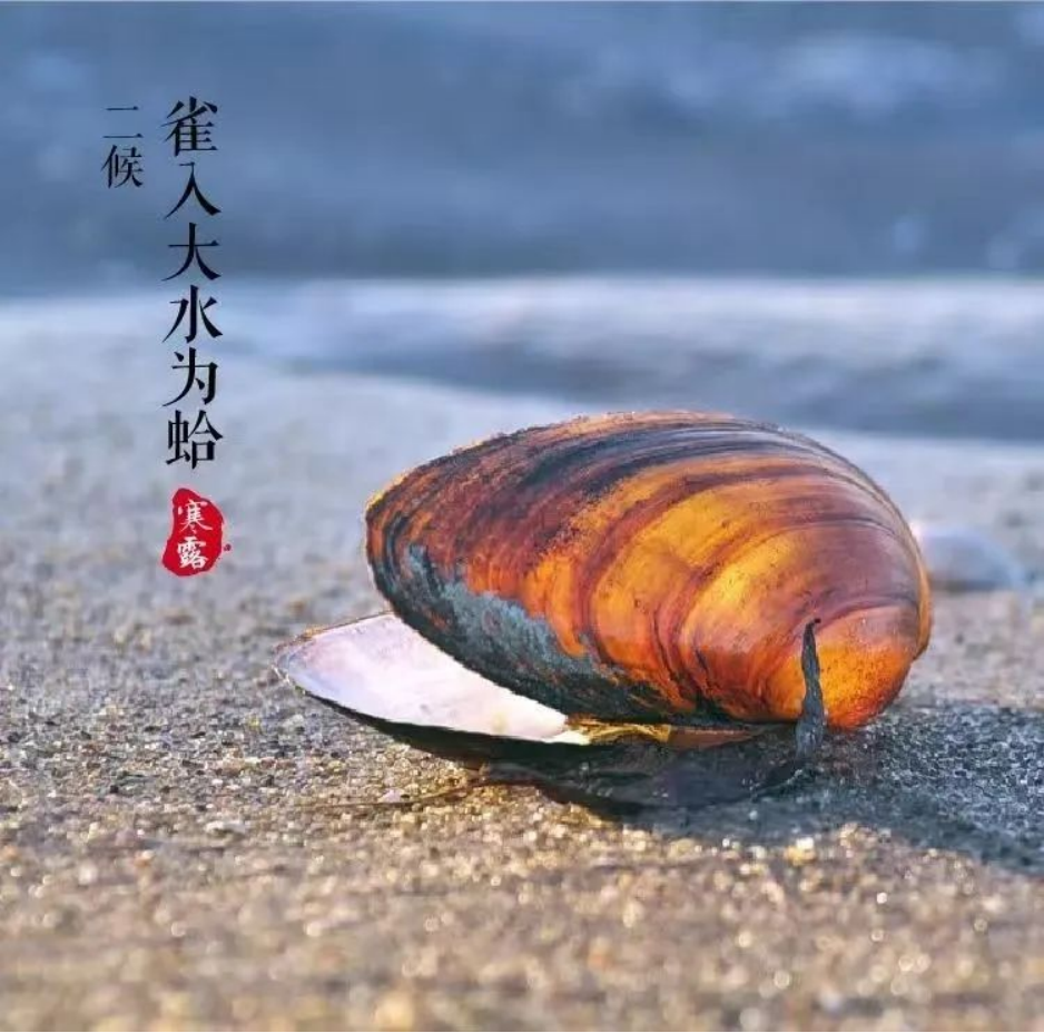 深秋天寒,雀鸟都不见了,而海边却突然出现很多壳纹及颜色与雀鸟相似的蛤蜊,古人不解,以为是雀入大水变成了蛤蜊。