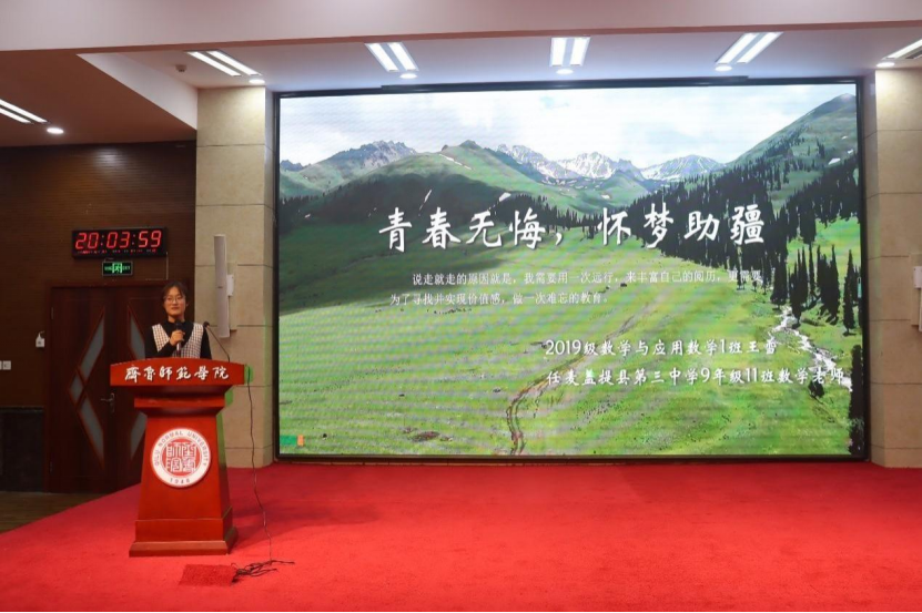 首期讲坛以“以青春之名,与祖国同行,将爱的种子撒在新疆”作为主题, 2019级数学与应用数学专业方思宁、王雪两位支教学生代表进行了发言。方思宁、王雪为代表的援疆执教学生积极响应党和国家的号召,远赴祖国边疆进行支教,在实践中认识自己,在实践中磨砺,在实践中成长,在实践中锤炼本领,更是在实践中对教师这一神圣的职业有了更加深刻的理解,用实际行动践行着“请党放心,强国有我”的青春誓言。他们热情饱满的工作状态,既赢得了实习支教学校领导老师们的一致好评,也充分展现了师院学子在祖国西部边陲砥砺奋进、顽强拼搏,用真心教育,用真情奉献的支教情怀。