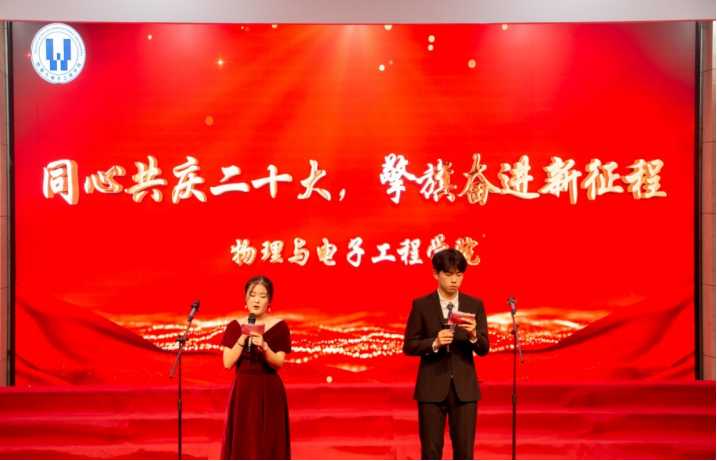 为活跃同学们的校园文化生活,培养学生爱党、爱国和爱校情感,进一步增强班级凝聚力,11月1日晚上七点,物理与电子工程学院在学校图书馆报告厅举办 “同心共庆二十大,挚旗奋进新征程 ”红歌合唱比赛。物理与电子工程学院党委书记陈宝金、院长张洁、党委副书记臧葳、团总支副书记张凤云,辅导员吕伟皓、杨沼佩、张萌,以及2022级全体学生参加活动。