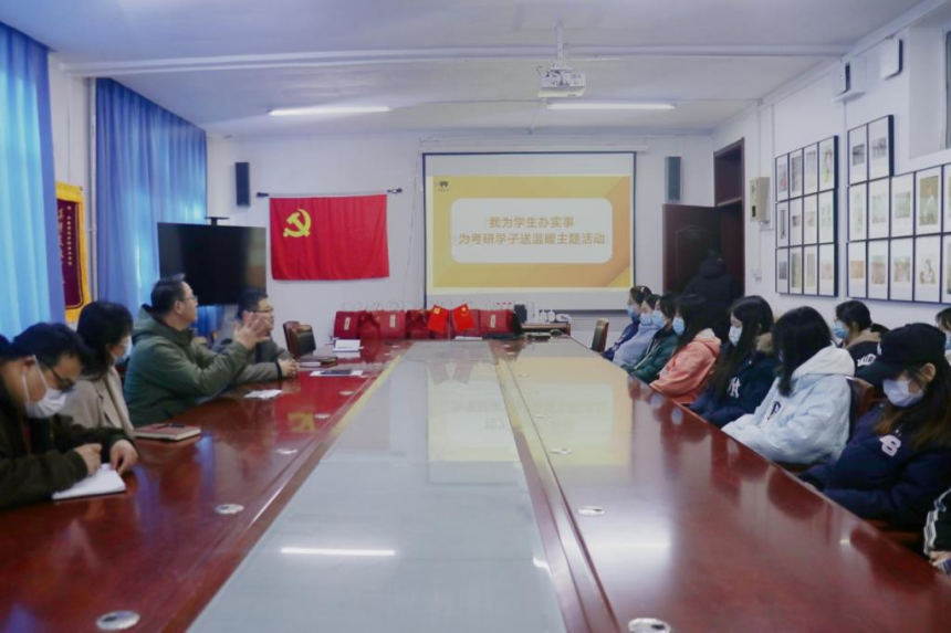 为进一步强化学风建设,营造良好的考研氛围,为考研学生加油鼓劲,12月5日上午,美术学院在历下校区209会议室开展“我为学生办实事-为考研学子送温暖”活动。学院党委书记辛源,院长杨三军,副院长李冉,院长助理王华军博士,办公室主任刘芳,团总支书记邹少爽,辅导员李玉涛、孟令强、刘婷、杨茜及15名考研学生代表参加活动。